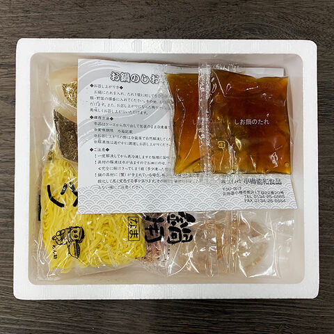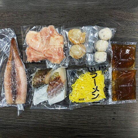 | 北海道産鶏もも肉100g×1袋、ボイル帆立×2個、たこ入つみれ15g×3個、ツボ抜きいか100g×1尾、助宗鱈切身40g×2切、冷凍生ラーメン80g×1玉、たれ(濃縮:塩仕立て)50ml×2袋 |