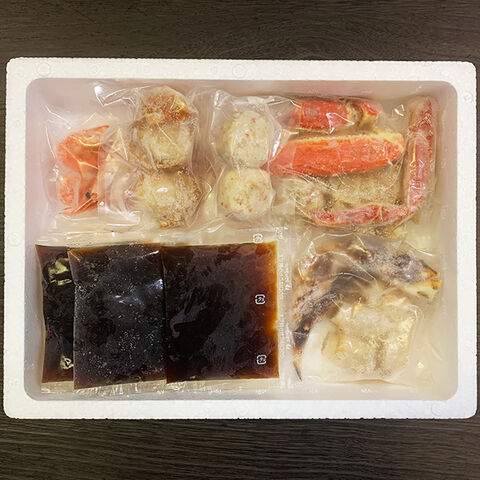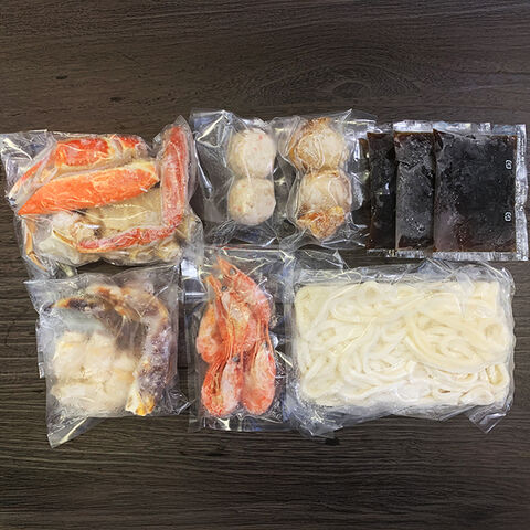 | ゆでずわいがにカット150g、生たらばがにカット100g、ボイル海老×3尾、ボイル帆立×2個、かに入つみれ×2個、冷凍うどん250g×1玉、たれ(濃縮:醤油仕立て)50ml×3袋(1~2人前) |