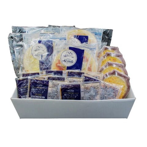 | 黒トリュフソースハンバーグ150g×8、ポテトグラタン200g×4、(マルゲリータピッツァ210g、黒トリュフと5種チーズのピッツァ185g)×各2 |
