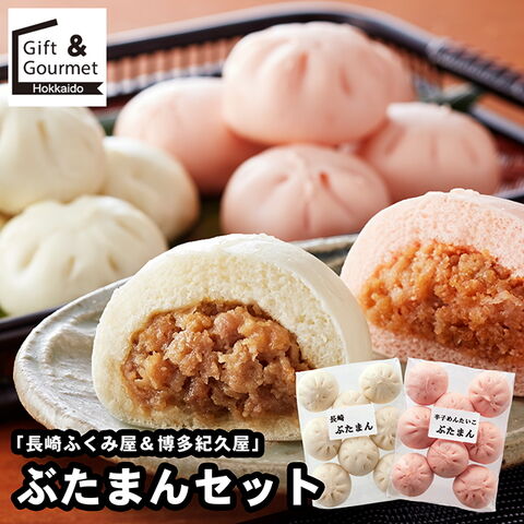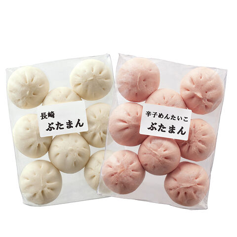 | 豚肉と玉ねぎなどを使い、ふっくらとした皮に包み込んだぶたまんと、辛子めんたいこのつぶつぶを加えた辛子めんたいこぶたまんのセットです。 |