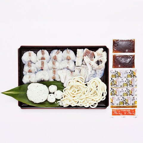 | まふくちり身・アラ500g、とらふく入りつみれ200g、とらふく入りうどん250g、ふく鍋だし45g×2、ポン酢35g×4、モミジオロシ16g |
