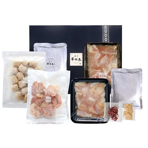 | 水たき濃縮スープ200g×1、華味鳥切り身200g×1、華味鳥つくね200g×1、もつ鍋スープ醤油(濃縮)200g×1、牛小腸200g×1、鶏はらみ100g×1、にんにくスライス5g×1、唐辛子1g×1 |