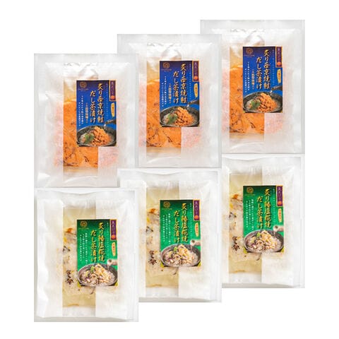 | 脂の乗った鮭の身を西京焼に仕立てただし茶漬けと、鰆の身を塩糀焼に仕立てただし茶漬けのセットです。それぞれに漬け込む事によって、うま味を引き出すと共に、さらにしっとりと柔らかい食感に仕立てています。ふっくらと焼き上げた身を、炙りを入れて香りも香ばしくする事で、より一層食欲をそそる風味となります。熱々のお出汁をかけて、また夏場の暑い季節には解凍したままの冷たいお出汁をかけて冷やし茶漬けとしても楽しめます。 |