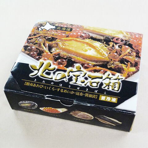 | 新鮮な魚介類はご飯との相性抜群。エゾあわび・いくら・するめいか ・昆布等素材にこだわり、丹精こめてつくった北の海鮮醤油漬「北の宝石箱」見た目も華やかですので、贈り物にぜひお選びください。 |