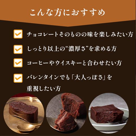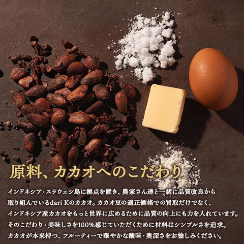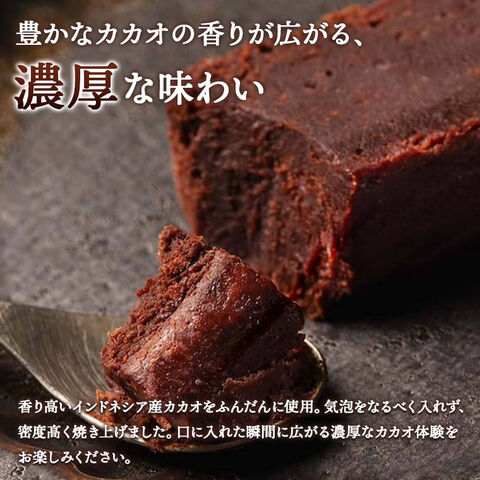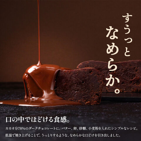 ダークチョコレートに、バター、卵、砂糖、小麦粉を合わせたシンプルなレシピ。低温で焼き上げることで、なめらかな口どけを引き出しました。インドネシア産カカオの濃厚な味わいをご堪能ください