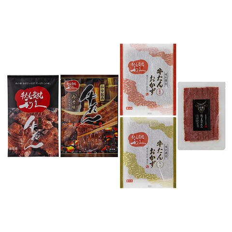 | 牛たん真空パック(塩味)100g、牛たん真空パック(味噌味)110g、牛たんおかず塩味120g、牛たんおかず味噌味120g、おつまみ牛たんペッパー味50g |