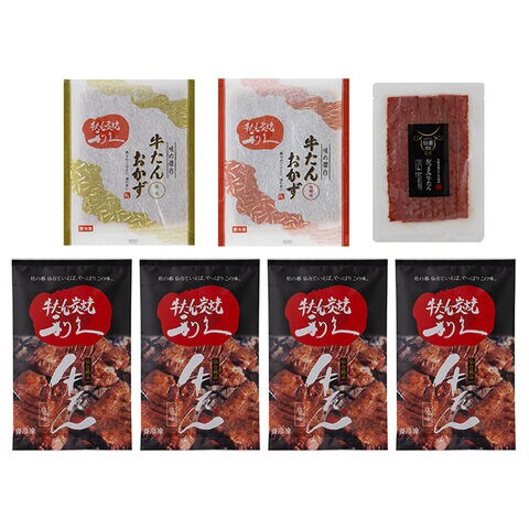 | 牛たん真空パック(塩味)100g×4、牛たんおかず塩味120g、牛たんおかず味噌味120g、おつまみ牛たんペッパー味50g |