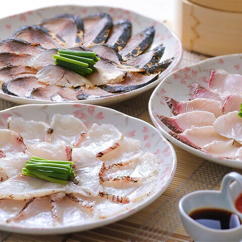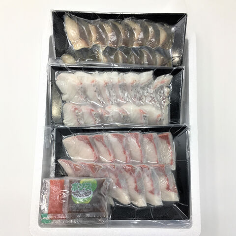 | 真鯛たたき120g、かんぱちたたき120g、しめ鯖たたき120g、ポン酢15g×3袋、もみじおろし3g×3袋 |