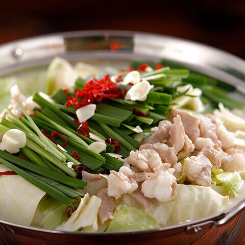 博多を代表する名物のコラボ、とんこつ味のもつ鍋。 牛もつはもちろん国内産を使用。 キャベツ、ニラなどたっぷり入れて食べたあとの 『しめ』のちゃんぽんが格別です。
