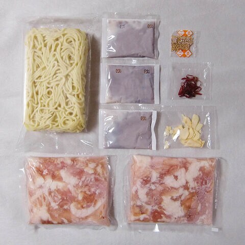 牛もつ肉(国内産)100g×2袋、ちゃんぽん麺180g×1玉、にんにく3g×1袋、唐辛子0.5g×1袋、白ごま0.7g×1袋、もつ鍋用濃縮とんこつスープ36g×3袋