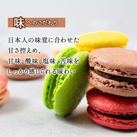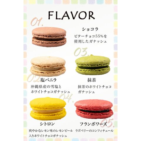 | マカロンフレーバー10種類 ・ショコラ(チョコレート) ビターチョコ55%を使用したガナッシュ ・塩バニラ 沖縄県産の雪塩とホワイトチョコガナッシュ ・シトロン(レモン) 爽やかなレモン味のレモンピール入りホワイトチョコガナッシュ ・抹茶 抹茶のホワイトチョコガナッシュ ・フランボワーズ ラズベリーのコンフィチュール ・ベリーチーズケーキ クリームチーズと3種のベリーミックスクリーム ・パッションミルクチョコ パッションフルーツとミルクチョコガナッシュ ・ラムレーズン ラム酒に漬け込んだレーズンと濃厚バタークリーム ・ピスターシュ シチリア産高級ピスタチオを使用したホワイトチョコガナッシュ ・アールグレイ アールグレイが香るミルクチョコガナッシュ |