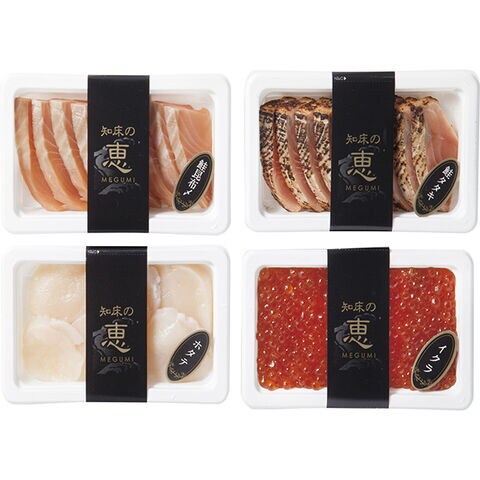 | 北海道産醤油いくら80g、知床産鮭たたき、知床産鮭昆布〆各60g、ほたて90g |