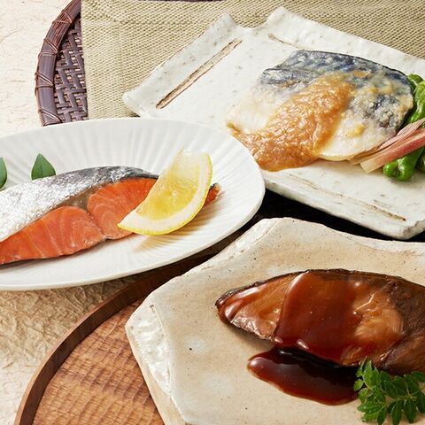 | めぬけと黄金生姜の煮付け100g×1、さばの味噌煮90g×2、紅鮭の塩焼き60g×1、ぶりの照焼き90g×2 |
