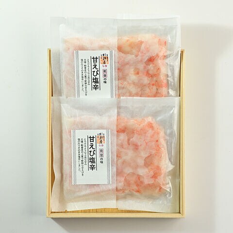 | 北陸産の甘エビを丁寧に手作業で殻剥きしました。味付けは食塩のみで、甘エビ本来の持ち味を引き出しています。とろける甘エビの素材の持ち味をご堪能いただけます。 |