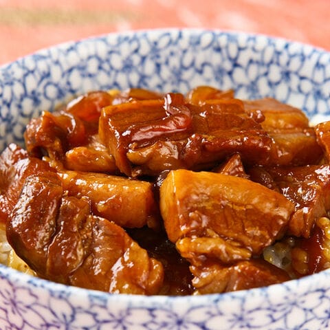 | 豚ばら肉を当店自慢のタレでじっくり煮込みとろけるような柔らかい角煮をひとくちサイズにカットし玉ねぎを加えました。熱々のご飯にのせてお召上がりください。 |