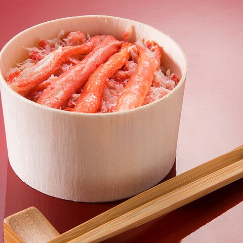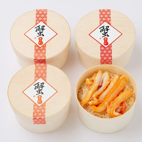 日本海で獲れた鮮度抜群な「ベニズワイガニ」をふんだんに使用しています。カニの旨味をたっぷり入れた当社特製の白だしで炊き上げたおこわに丁寧にほぐしたカニ身をふんだんにふりかけ、更に贅沢にカニのむき身をトッピングしました。