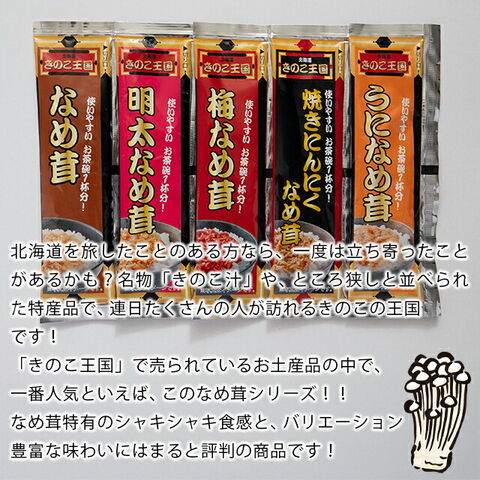 ・なめ茸 ・明太なめ茸 ・梅なめ茸 ・うになめ茸 ・焼きにんにくなめ茸 各1袋(30g) 5袋セット |