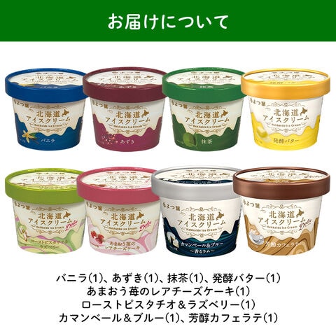 | バニラ/クリーム(北海道製造)、脱脂濃縮乳(北海道製造)、砂糖、卵黄(卵を含む)/バニラ香料 あずき/クリーム(北海道製造)、こしあん(砂糖、あずき(北海道十勝産)、食塩)、かのこ豆(大納言あずき(北海道産)、砂糖)、脱脂粉乳(北海道製造)、砂糖、水あめ、卵黄(卵を含む) 抹茶/クリーム(北海道製造)、脱脂濃縮乳(北海道製造)、砂糖、水あめ、卵黄(卵を含む)、加糖練乳(北海道製造)、脱脂粉乳(北海道製造)、ナチュラルチーズ(北海道製造)、抹茶/酸味料 発酵バター/脱脂濃縮乳(北海道製造)、発酵バター(北海道製造)、砂糖、卵黄(卵を含む)、食塩/乳化剤 ローストピスタチオ&ラズベリー/脱脂濃縮乳(北海道製造)、クリーム(北海道製造)、砂糖、ピスタチオペースト(アーモンドを含む)、ラズベリーソース(ラズベリー、イソマルトオリゴ糖水あめ、砂糖、麦芽糖、洋酒)、卵黄(卵を含む)、食塩/増粘多糖類、酸味料 カマンベール&ブルー ~香るラム~/脱脂濃縮乳(北海道製造)、クリーム(北海道製造)、砂糖、ナチュラルチーズ(北海道製造)、卵黄(卵を含む)、洋酒/酸味料 芳醇カフェラテ/クリーム(北海道製造)、脱脂濃縮乳(北海道製造)、砂糖、水あめ、エスプレッソソース、コーヒー、脱脂粉乳(北海道製造)、粉あめ、卵黄(卵を含む)? あまおう苺のレアチーズケーキ/脱脂濃縮乳(北海道製造)、ナチュラルチーズ(北海道製造)、苺ソース、砂糖、クリーム(北海道製造)、卵黄(卵を含む)、バターミルクパウダー(北海道製造)、食塩/増粘多糖類、酸味料 |