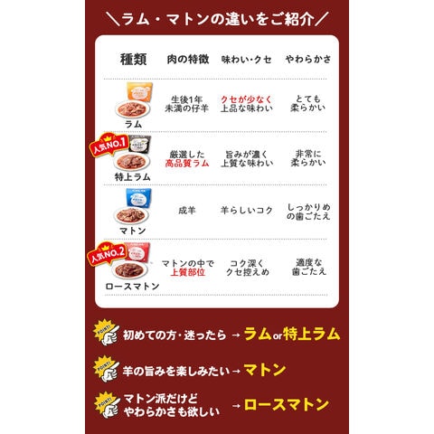 | ロースマトン/羊肉(オーストラリア産) たれ/醤油(製造過程で小麦使用)、りんご、たまねぎ、砂糖、生姜、加糖粉末(ぶどう糖、グラニュー糖)、香辛料、ガーリックグラニュール、調味料(アミノ酸等))、酸味料 ラム/仔羊肉(ニュージーランド産) たれ/醤油(製造過程で小麦使用)、りんご、たまねぎ、砂糖、生姜、加糖粉末(ぶどう糖、グラニュー糖)、香辛料、ガーリックグラニュール、調味料(アミノ酸等)、酸味料 |