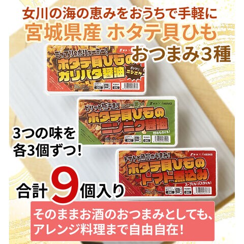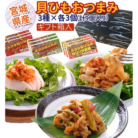 [化粧箱入 ホタテ貝ひも3種×3パック] 合計9パック入り 鮮冷 おつまみ 惣菜 時短商品 お中元 お歳暮 母の日 父の日 ギフト 宮城県産 送料無料 即送 沖縄県・離島へ発送不可