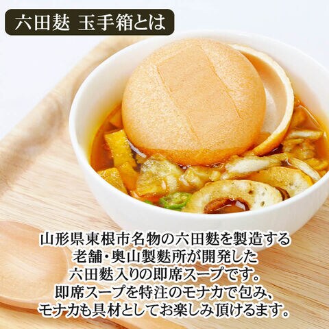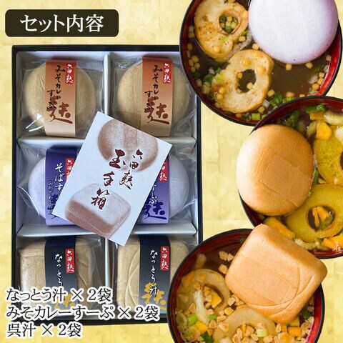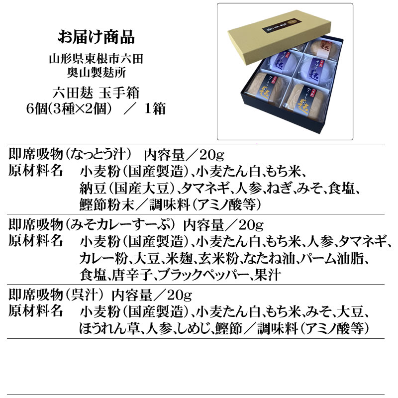 山形県東根市六田 奥山製麸所 即席スープ [六田麸 玉手箱6個入] なっとう汁×2個 みそカレーすーぷ×2個 呉汁×2個 贈答対応 送料無料 沖縄・離島配送不可