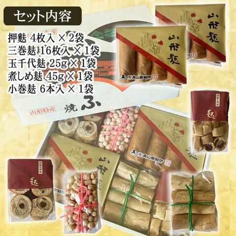 | セット内容 | 押麩4枚入×2袋 三巻麸16枚入×1袋 玉千代麸25g×1袋 煮しめ麸45g×1袋 小巻麸6本入×1袋 |