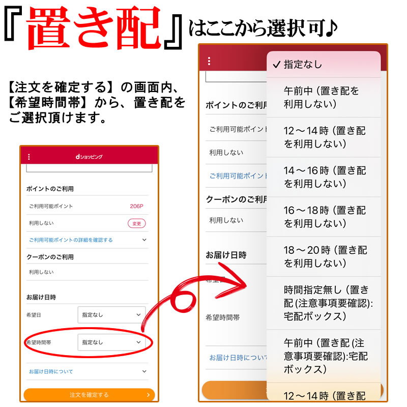 置き配をご希望の場合、「注文を確定する」画面内、「希望時間帯」から、宅配ボックス、玄関前、メーターボックス、物置、車庫への置き配指定が可能となり、佐川急便の指定場所配送サービスでの発送となります。