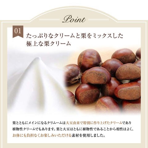 【たっぷりなクリームを栗とミックスした極上な栗クリーム】栗とともにメインとなるクリームは大豆由来で特別に創り上げたクリームであり植物性クリームでもあります。栗と大豆はともに植物性でもあることから相性はよく、お体にも負担少なくお楽しみ戴ける素材での商品化です。