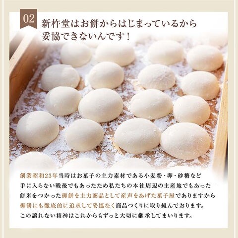 【新杵堂はお餅からはじまっているから妥協できないんです】創業昭和23年当時はお菓子の主力素材である小麦粉・卵・砂糖など手に入らない戦後でもあったため私たちの本社周辺の主産地でもあった餅米をつかった御餅を主力商品として産声をあげた菓子屋でありますから御餅にも徹底的に追求して妥協なく商品つくりに取り組んでおります。この譲れない精神はこれからもずっと大切に継承してまいります。
