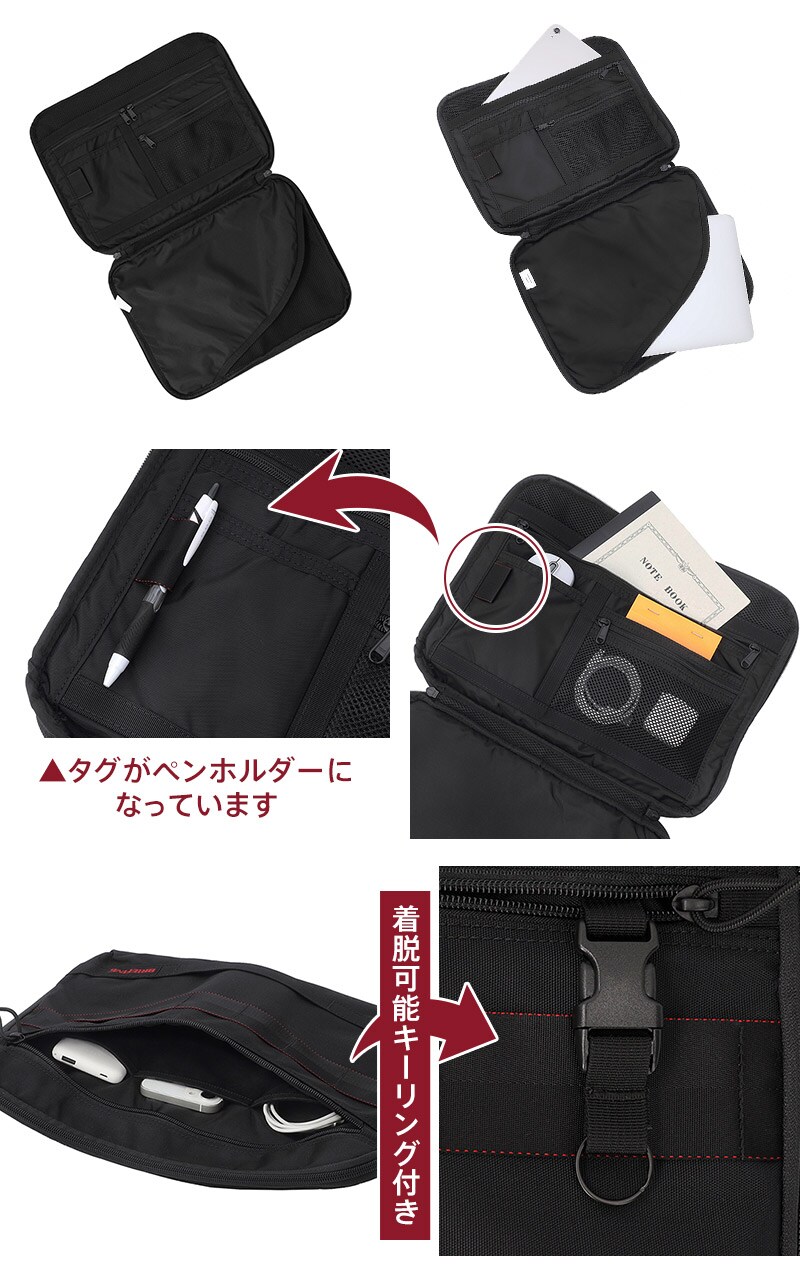 | 備考 | 【メイン開閉】ダブルファスナー(ラウンド開閉) 外側/ ファスナーポケット×1(メッシュオープンポケット×3、着脱可能キーリング×1) 内側/ パッド入りPCポケット×2 オープンポケット×2 ファスナーポケット×1 メッシュファスナーポケット×1 ペンホルダー×1 その他機能/ フロント下部にハンドルを搭載 メイン収納はラウンド開閉仕様でフルオープン可能 フロントにデイジーチェーン搭載 キーワード: モジュールウェアコレクション 高機能性 耐久性 インナーバッグ 手提げ 仕事 スーツ 黒 旅行 出張 ガジェット A4サイズ 横型 ビジカジ シンプル 無地 かっこいい 人気 大人 キレイめ 仕事 就職祝い 営業 日帰り 電子機器 ツール オフィス IT トラベル 20代 30代 40代 50代 社会人 プレゼント ギフト メンズ レディース 男性 女性 通勤 通学 ビジネス 学生 ブランド ポイント消化 ニューバッグワカマツ ニューバックワカマツ | ||