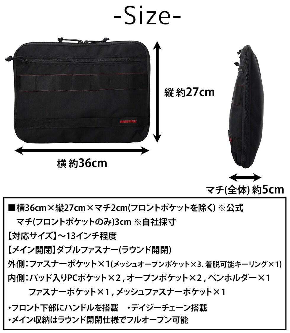 | サイズ(約) ※当店実寸値 | 公式サイズ 横36cm×縦27cm×マチ2cm(フロントポケットを除く) 自社採寸サイズ マチ(フロントポケットのみ)3cm 【対応サイズ】~13インチ程度 | ||