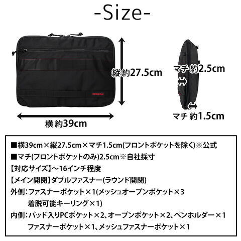 | 備考 | 【メイン開閉】ダブルファスナー(ラウンド開閉) 外側/ ファスナーポケット×1(メッシュオープンポケット×3、着脱可能キーリング×1) 内側/ パッド入りPCポケット×2 オープンポケット×2 ファスナーポケット×1 メッシュファスナーポケット×1 ペンホルダー×1 その他機能/ フロント下部にハンドルを搭載 メイン収納はラウンド開閉仕様でフルオープン可能 フロントにデイジーチェーン搭載 キーワード: モジュールウェアコレクション 高機能性 耐久性 インナーバッグ 手提げ 仕事 スーツ 黒 旅行 出張 ガジェット A4ファイル 横型 ビジカジ シンプル 無地 かっこいい 人気 大人 キレイめ 仕事 就職祝い 営業 日帰り 電子機器 ツール オフィス IT トラベル 20代 30代 40代 50代 社会人 プレゼント ギフト メンズ レディース 男性 女性 通勤 通学 ビジネス 学生 ブランド ポイント消化 ニューバッグワカマツ ニューバックワカマツ | ||