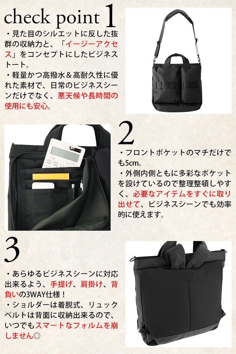 | 備考 | 【メイン開閉】ホック、ダブルファスナー 外側/ 前面右L字ファスナーポケット×1(オープンポケット×1、着脱可能キーリング×1) 前面左L字ファスナーポケット×1(オープンポケット×2、ファスナーポケット×1、ペン挿し×2) 内側/ パッド入りPCポケット×1(ホック開閉) メッシュファスナーポケット×2 付属/ ショルダーストラップ×1 その他機能/ 持ち手を束ねるホックストラップ付き リュックベルト不要時は背面に収納可能 背面は通気性に優れたメッシュ素材を起用 フロントにデイジーチェーン搭載 キーワード: ソリッドウェーブコレクション 高機能性 耐久性 耐水 撥水 13インチ キャリーオン バックパック 仕事 スーツ 黒 旅行 出張 ガジェット A4サイズ 縦型 3ウェイ ビジカジ シンプル 無地 かっこいい 人気 大人 キレイめ 仕事 就職祝い 営業 日帰り 電子機器 ツール オフィス IT トラベル 20代 30代 40代 50代 社会人 プレゼント ギフト メンズ レディース 男性 女性 通勤 通学 ビジネス 学生 ブランド ポイント消化 ニューバッグワカマツ ニューバックワカマツ | ||