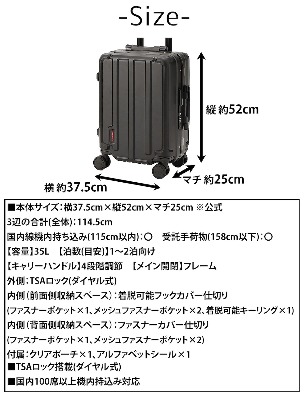 | サイズ(約) ※当店実寸値 | 公式サイズ 外寸:横37.5cm×縦52cm×マチ25cm 3辺合計:114.5cm 国内線機内持ち込み(115cm以内):〇 受託手荷物(158cm以下):〇 容量:35L 泊数(目安):公式|2~3泊程度、自社|1~2泊程度 キャリーハンドル:4段階調節 | ||