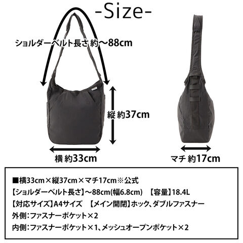 | サイズ(約) ※当店実寸値 | 公式サイズ 横33cm×縦37cm×マチ17cm 【ショルダーベルト長さ】~88cm(幅6.8cm) 【容量】18.4L 【対応サイズ】A4サイズ | ||