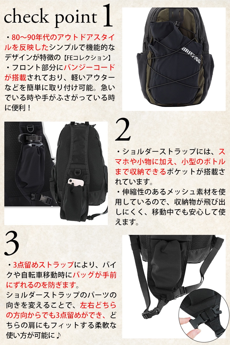 | 備考 | 【メイン開閉】ダブルファスナー 外側/ バンジーコード×1 ファスナーポケット×1(オープンポケット×1、メッシュオープンポケット×1) サイドオープンポケット×2(伸縮性あり) ボトルポケット×1(伸縮性あり) Dカン×1 内側/ パッド入りタブレットポケット×1 メッシュファスナーポケット×1 その他機能/ ・3点留めベルト付き キーワード: FEコレクション 高機能性 耐久性 仕事 スーツ 黒 紺 緑 旅行 トラベル 出張 タテ型 10L ビジカジ シンプル 無地 かっこいい 人気 大人 キレイめ 仕事 就職祝い オフィス IT 20代 30代 40代 50代 社会人 自分用 ご褒美 プレゼント ギフト メンズ レディース 男性 女性 通勤 通学 ビジネス 学生 ブランド ポイント消化 ニューバッグワカマツ ニューバックワカマツ | ||