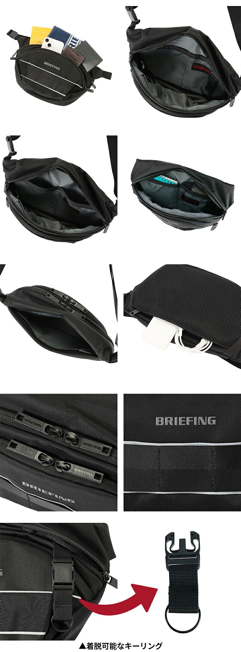 。外内ポケットや着脱可能なキーリングで必要な物を整理でき、背面ポケットはクッション入りでスマホやタブレットなどを安心して収納できます。
