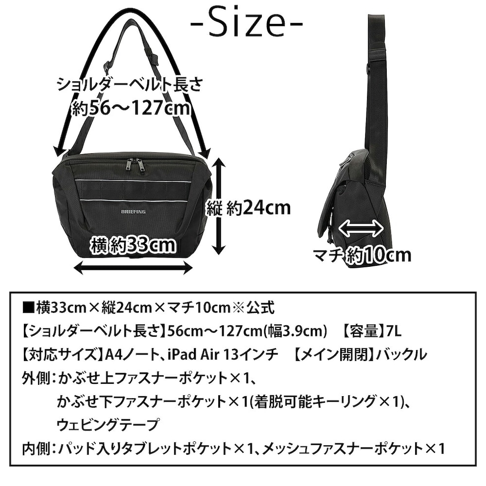 | サイズ(約) ※当店実寸値 | 公式サイズ 横33cm×縦24cm×マチ10cm 【ショルダーベルト長さ】56cm~127cm(幅3.9cm) 【容量】7L 【対応サイズ】A4ノート | ||