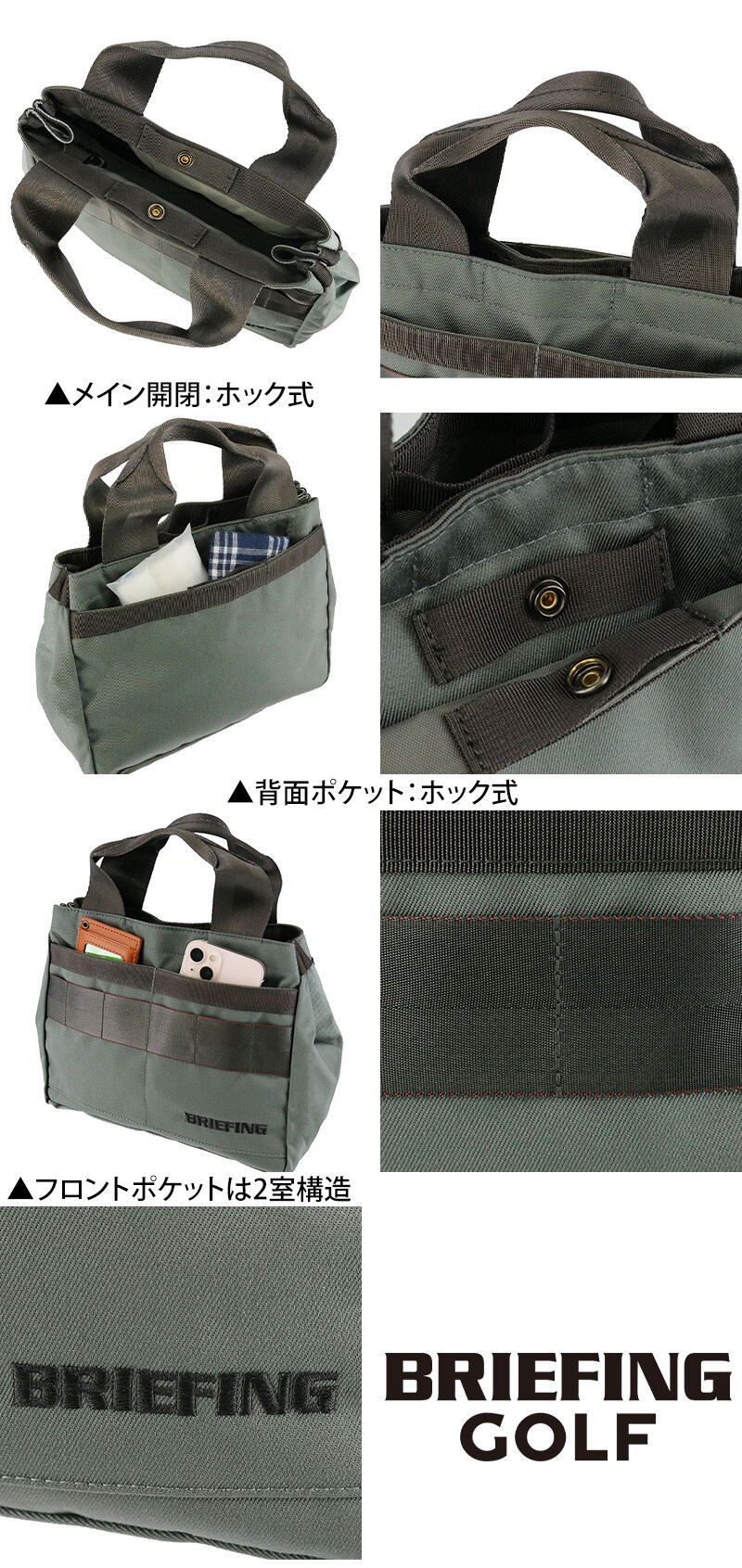 ・スコアカードを入れるのに便利な前面ポケットを搭載、内部にもポケットやキーホルダーを装備。