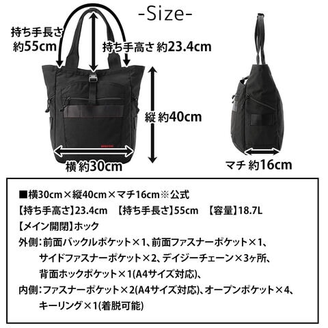 | サイズ(約) ※当店実寸値 | 公式サイズ 横30cm×縦40cm×マチ16cm 【持ち手高さ】24cm 【持ち手長さ】55cm 【容量】18.7L | ||