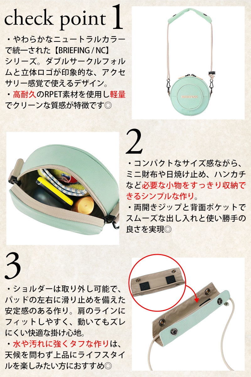 | 備考 | 【メイン開閉】ダブルファスナー 外側/ オープンポケット×1 付属/ ショルダーストラップ×1 肩パッド×1 キーワード : 街歩きバッグ サブバッグ 旅行バッグ デイリーユース タウンユース 軽量 丈夫 小物収納 高校生 大学生 アウトドア 1万円以下 小さめ 財布収納 スマホ収納 カードケース収納 ポケット付き 丸型 円形 ラウンド型 ミニバッグ コンパクトバッグ ショルダーバッグ ミニショルダー ポーチ メンズ レディース BRIEFING ブリーフィング NCシリーズ サークルショルダー カジュアル おしゃれ シンプル プレゼント ギフト ラッピング ラッピング可能 男性 女性 ビジネス 学生 ブランド ポイント消化 ニューバッグワカマツ ニューバックワカマツ | ||