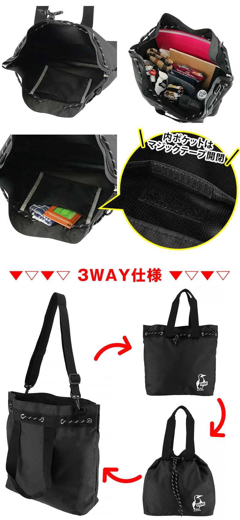 ・手持ち、斜め掛け、巾着バッグの3way仕様
