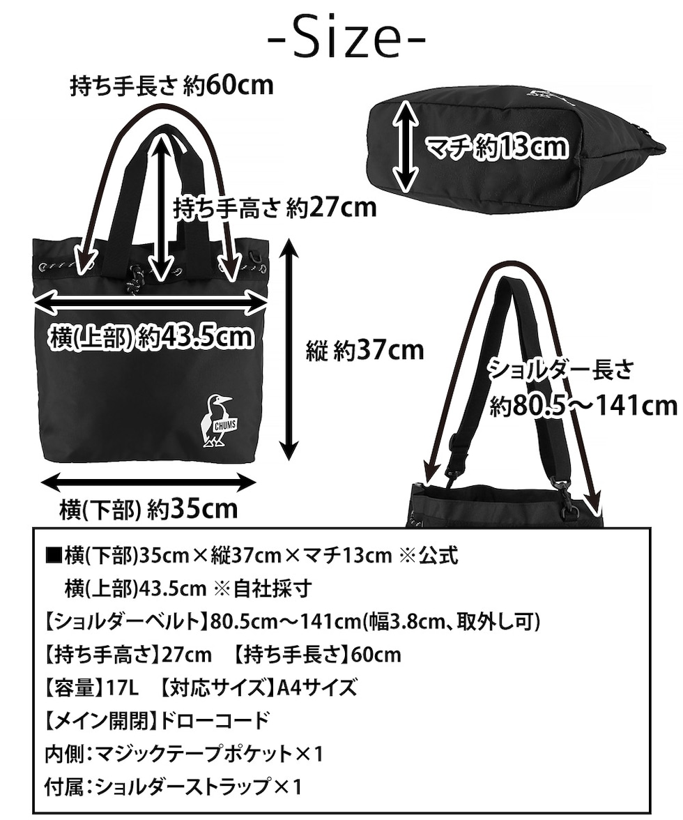 | サイズ(約) ※当店実寸値 | 公式サイズ 横(下部)35cm×縦37cm×マチ13cm 自社採寸サイズ 横(上部)43.5cm 【持ち手高さ】27cm 【持ち手長さ】60cm 【ショルダーベルト】80.5cm~141cm(幅3.8cm、取外し可) 【対応サイズ】A4サイズ 【容量】17L | ||