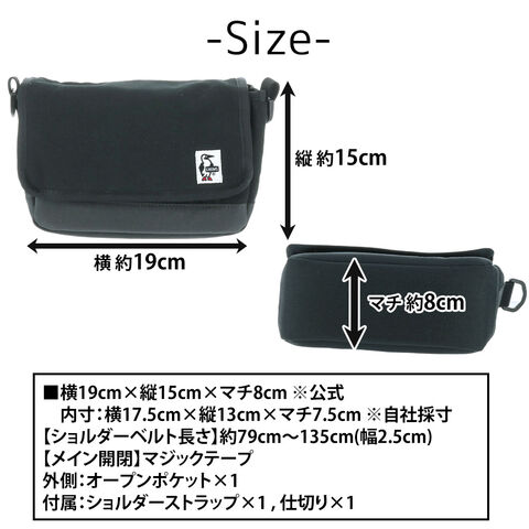 | サイズ(約) ※当店実寸値 | 公式サイズ 横19cm×縦15cm×マチ8cm 自社採寸サイズ(内寸) 横17.5cm×縦13cm×マチ7.5cm 【ショルダーベルト長さ】79cm~135cm(幅2.5cm、取外し可) 【容量】2L | ||
