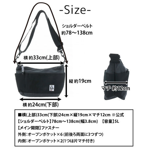 | サイズ(約) ※当店実寸値 | 公式サイズ 横(上部)33cm(下部)24cm×縦19cm×マチ12cm 【ショルダーベルト長さ】78cm~138cm(幅3.8cm、取外し可) 【容量】5L | ||
