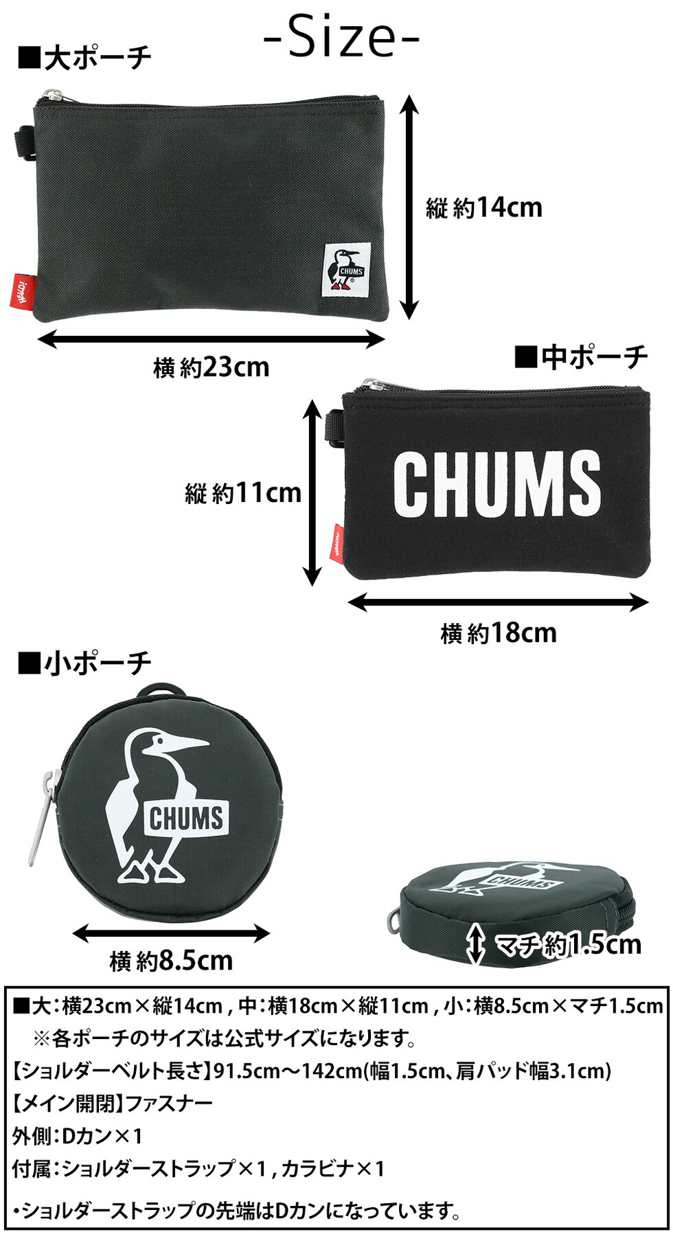 | サイズ(約) ※当店実寸値 | 公式サイズ 大:横23cm×縦14cm 中:横18cm×縦11cm 小:横8.5cm×マチ1.5cm 【ショルダーベルト長さ】91.5cm~142cm(幅1.5cm、肩パッド幅3.1cm、取外し可) | ||