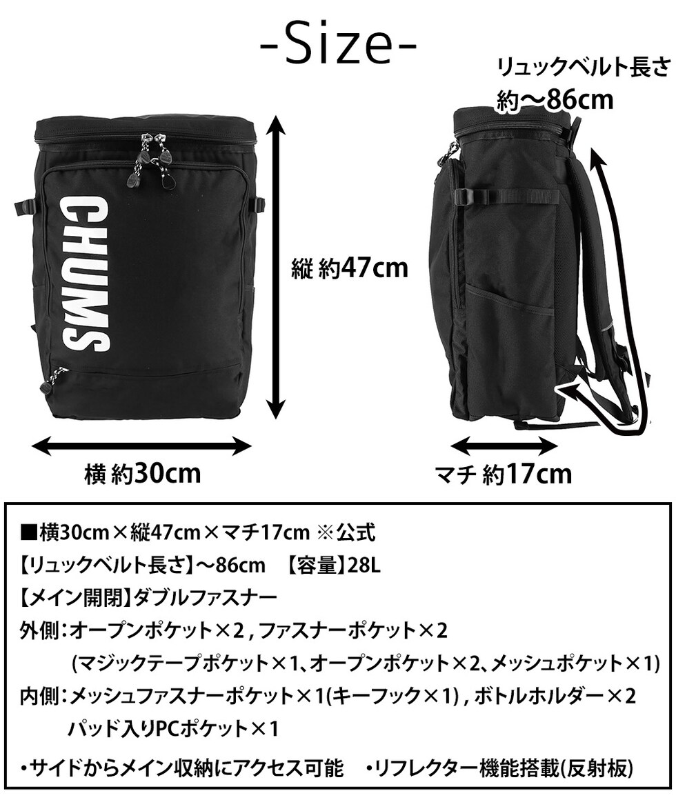 | サイズ(約) ※当店実寸値 | 公式サイズ 横30cm×縦47cm×マチ17cm 【リュックベルト長さ】~86cm 【容量】28L | ||