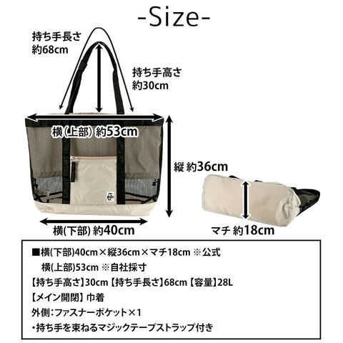 | サイズ(約) ※当店実寸値 | 公式サイズ 横(下部)40cm×縦36cm×マチ18cm 自社採寸サイズ 横(上部)53cm 【持ち手高さ】30cm 【持ち手長さ】68cm 【容量】28L | ||