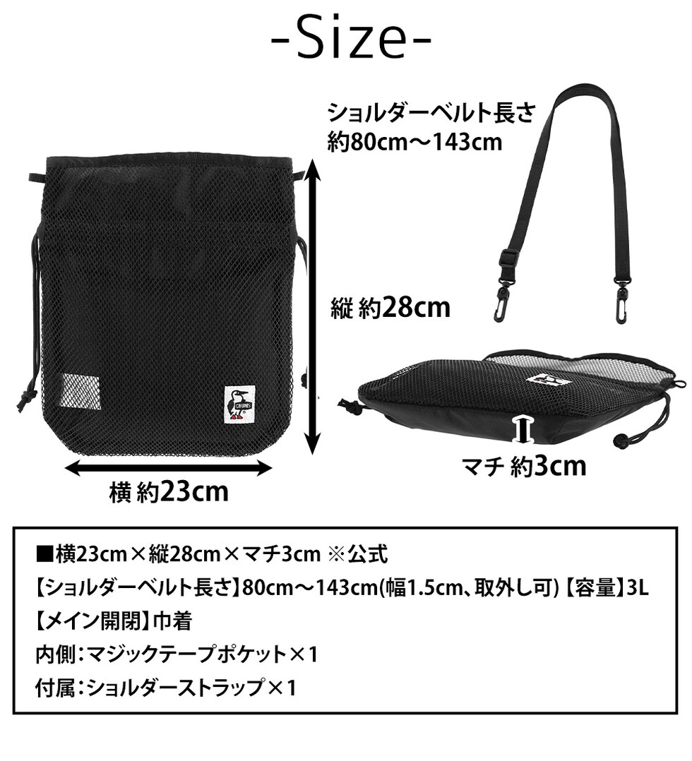 | サイズ(約) ※当店実寸値 | 公式サイズ 横23cm×縦28cm×マチ3cm 【ショルダーベルト長さ】80cm~143cm(幅1.5cm、取外し可) 【容量】3L | ||