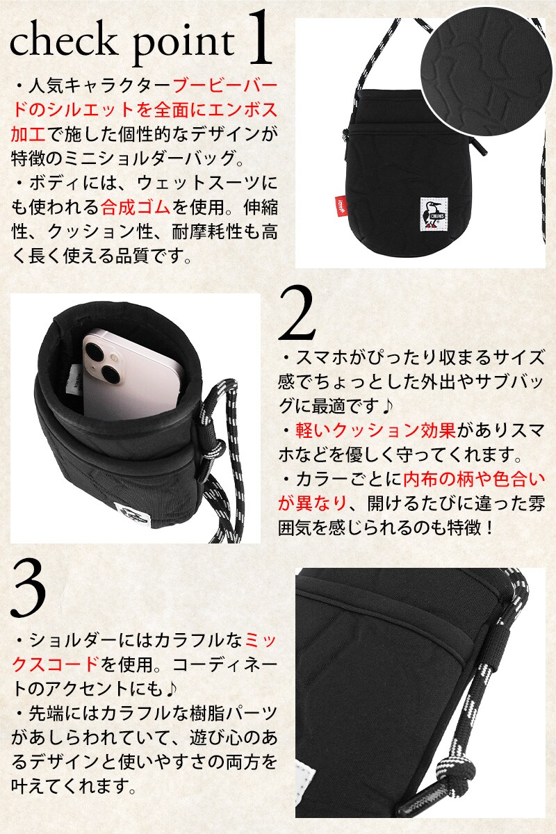 CHUMSの象徴ブービーバードが全面にあしらわれた『ブービーエンボスミニショルダーバッグ』
